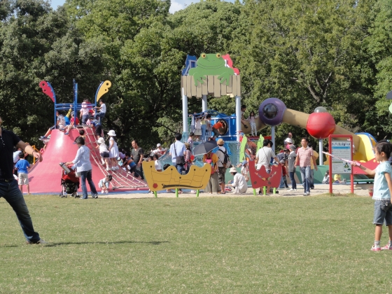 中央芝生広場には、子供たちが楽しめる遊具や、家族でスポーツが楽しめる広さがあって、お弁当持参で遊ぶ子連れに最高の公園です。