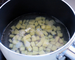 じゃがいもは角切りにして茹で水気を切る。 玉葱、にんにくはみじん切りにする。