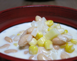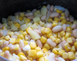 鍋にバターを溶かし玉葱、にんにく、塩を入れ10分炒める。トウモロコシを加え、更に10分炒めて、①の豆を入れる。